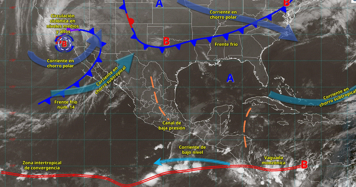 El Servicio Meteorológico Nacional informó que lluvias puntuales fuertes impactarán este día a Baja California y Chiapas, debido al desplazamiento del frente frío número 14 sobre el noroeste de México, el cual interactúa con una vaguada en niveles medios y altos, así como con las corrientes en chorro polar y subtropical. Este sistema provocará descenso de temperatura, rachas de viento de hasta 70 km/h y condiciones inestables que afectarán principalmente a Sonora, Chihuahua y la región noroeste del país.