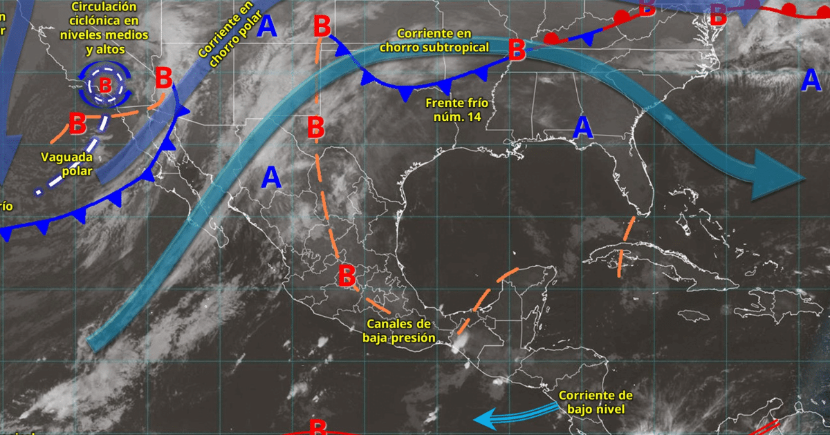 Para hoy, el frente frío núm. 15 asociado con una vaguada polar y con una circulación ciclónica en niveles medios y altos de la atmósfera, recorrerá el noroeste y norte de México, y en interacción con las corrientes en chorro polar y subtropical, ocasionarán lluvias puntuales fuertes en Sonora, Chihuahua y Sinaloa; y chubascos en Baja California, Baja California Sur y Durango, rachas de viento muy fuertes de 60 a 80 km/h en Sonora, Chihuahua y Durango; con marcado descenso en las temperaturas sobre dichos estados, además de mantener condiciones para la caída de nieve y/o aguanieve en sierras de Baja California, Sonora y Chihuahua, las cuales se extenderán hacia el norte de Sinaloa y Durango durante esta noche y la madrugada del jueves. Por otra parte, el ingreso de humedad del golfo de México y una línea seca que se establecerá por la tarde en el norte de Coahuila, generarán lluvias puntuales fuertes en el norte de dicho estado; así como chubascos en Nuevo León y Zacatecas; y lluvias aisladas en zonas de Tamaulipas y San Luis Potosí, así como rachas de viento fuertes de 50 a 70 km/h en zonas de Zacatecas, San Luis Potosí, Coahuila, Nuevo León y Tamaulipas. El ingreso de aire húmedo proveniente del océano Pacífico, golfo de México y mar Caribe, en interacción con canales de baja presión en el interior del país, sureste mexicano y península de Yucatán, originarán lluvias puntuales fuertes en Guerrero (sur) y Chiapas (sur); chubascos en Quintana Roo, Yucatán, Campeche, Tabasco, Veracruz (regiones Papaloapan y Olmeca), Oaxaca, Michoacán, Colima, Jalisco y Nayarit; y lluvias aisladas en zonas de Puebla, Morelos, Ciudad de México, Estado de México, Hidalgo, Querétaro y Guanajuato. Finalmente, prevalecerá ambiente frío a muy frío sobre entidades de la Mesa del Norte y Mesa Central, con posibles heladas al amanecer, y ambiente gélido con temperaturas mínimas menores a -5°C y heladas en zonas serranas de Chihuahua y Durango.