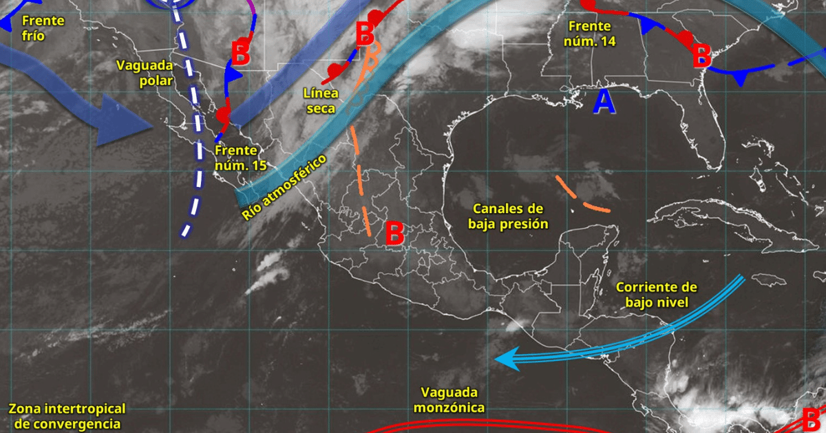 Este día, el frente núm. 15 se desplazará sobre el norte y noreste del país, en interacción con una vaguada polar, la corriente en chorro polar y un río atmosférico, mantendrán ambiente frío a muy frío; vientos muy fuertes a intensos, con rachas de 80 a 90 km/h en Chihuahua, Coahuila y Durango; así como lluvias puntuales fuertes en Baja California (norte), Sonora (norte y este), Coahuila (norte), Nuevo León (norte) y Tamaulipas (noroeste); y chubascos en Chihuahua, Sinaloa y Durango. A su vez, persisten condiciones para caída de nieve o aguanieve en las sierras de Baja California, Sonora y Chihuahua.