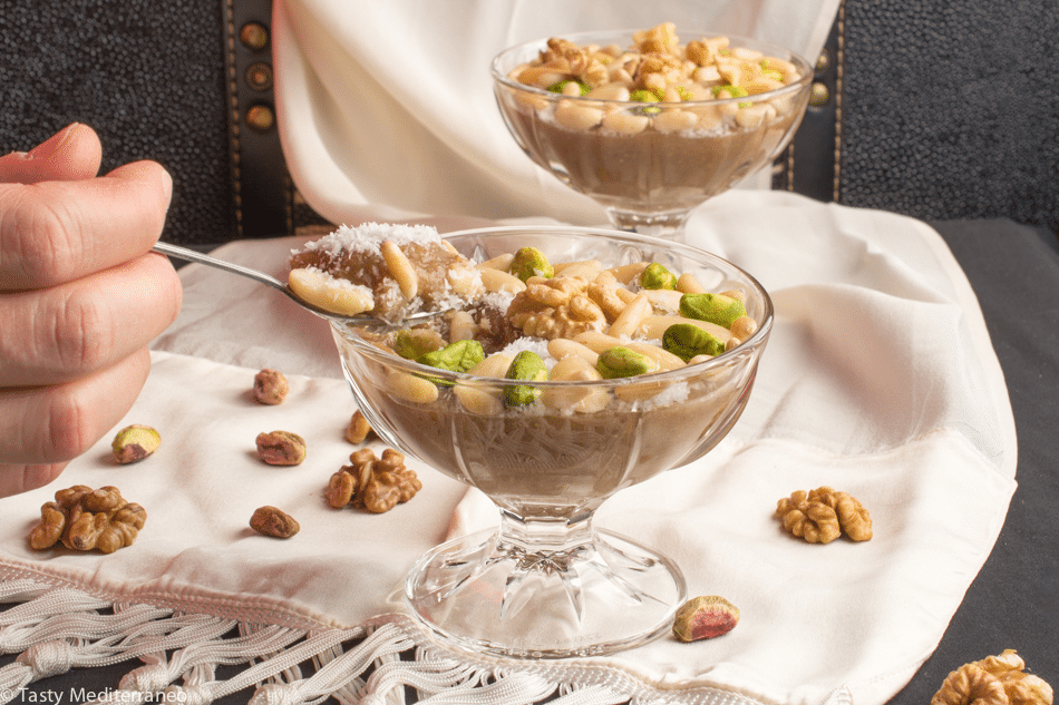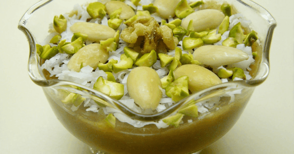 Un buen Meghli no está completo sin su “cobertura”. El contraste de texturas es vital. El budín suave y frío se cubre primero con una capa generosa de coco rallado (que algunos dicen simboliza la nieve del invierno libanés). Sobre el coco, se esparce una mezcla de frutos secos que, tradicionalmente, se han dejado en remojo en agua fría horas antes para que estén tiernos y crujientes a la vez: almendras, nueces, pistachos y piñones.