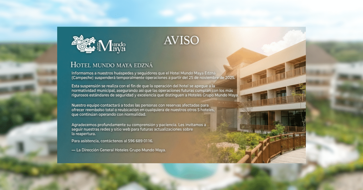 Campeche, 25 de noviembre de 2025.– Hoteles Grupo Mundo Maya informó que el Hotel Mundo Maya Edzná detendrá sus operaciones de manera temporal después de una inspección rutinaria realizada en coordinación con autoridades municipales, como parte de sus acciones para garantizar un servicio seguro y de calidad.