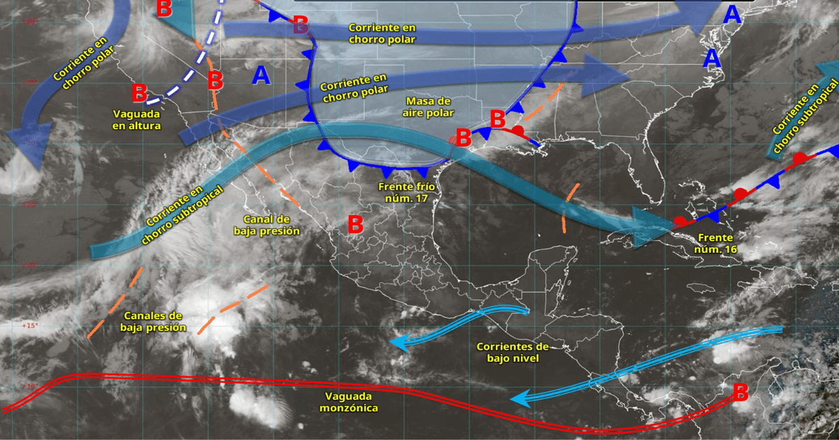 El frente frío número 17, acompañado de una masa de aire polar y la influencia de corrientes en chorro, ocasionará lluvias muy fuertes en Tamaulipas, fuertes en Veracruz y un marcado descenso térmico en estados del norte, además de rachas de viento y condiciones invernales en zonas serranas.