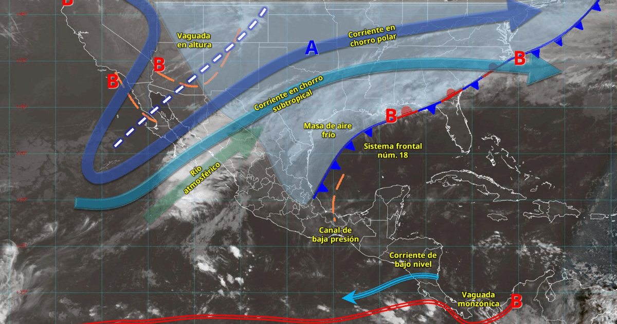 El frente frío número 18 permanecerá estacionario sobre el noreste y oriente del país, mientras un abundante flujo de humedad del Pacífico —impulsado por un río atmosférico y una vaguada en niveles medios y altos— ocasionará lluvias y chubascos en diversas regiones.