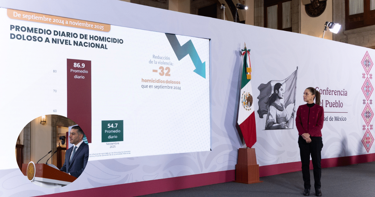 La Presidenta de México, Claudia Sheinbaum Pardo, resaltó que, gracias a la implementación de la Estrategia Nacional de Seguridad, se logró una reducción del 37 por ciento en el promedio diario de homicidios dolosos, de septiembre de 2024 a noviembre de 2025, al pasar de un promedio de 86.9 víctimas diarias a 54.7, lo que representa 32 homicidios diarios menos; ubicando a noviembre de 2025 como el mes más bajo desde 2015.