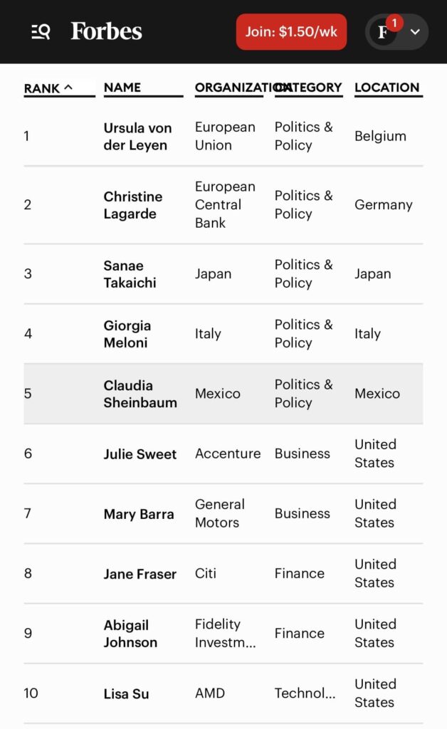 Forbes describe a Sheinbaum como la mujer que “hizo historia al ser elegida la primera presidenta de México con una victoria aplastante en junio de 2024. Su toma de posesión ese octubre fue recibida con vítores de ‘Presidenta’”. La publicación también destaca su trayectoria académica, recordando que es “una científica reconocida con un doctorado en ingeniería energética, y una de las investigadoras y legisladoras que compartieron el Premio Nobel de la Paz 2007 por su participación en el panel climático de la ONU”.