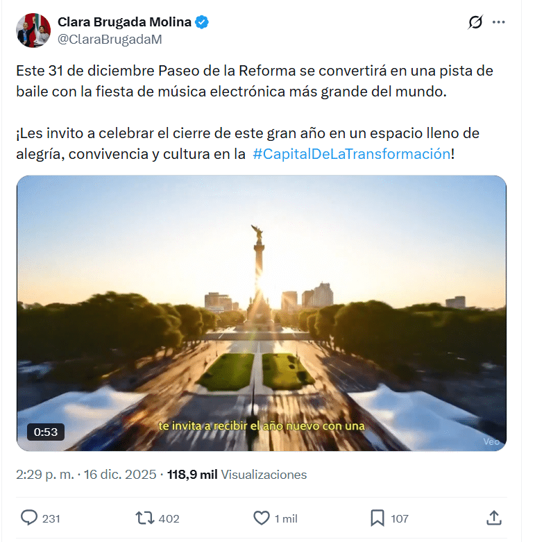 La jefa de Gobierno, Clara Brugada, informó que el próximo 31 de diciembre la avenida se transformará en una pista de baile monumental, con un festival gratuito que busca reunir a miles de personas para despedir el año al ritmo de DJs nacionales e internacionales.