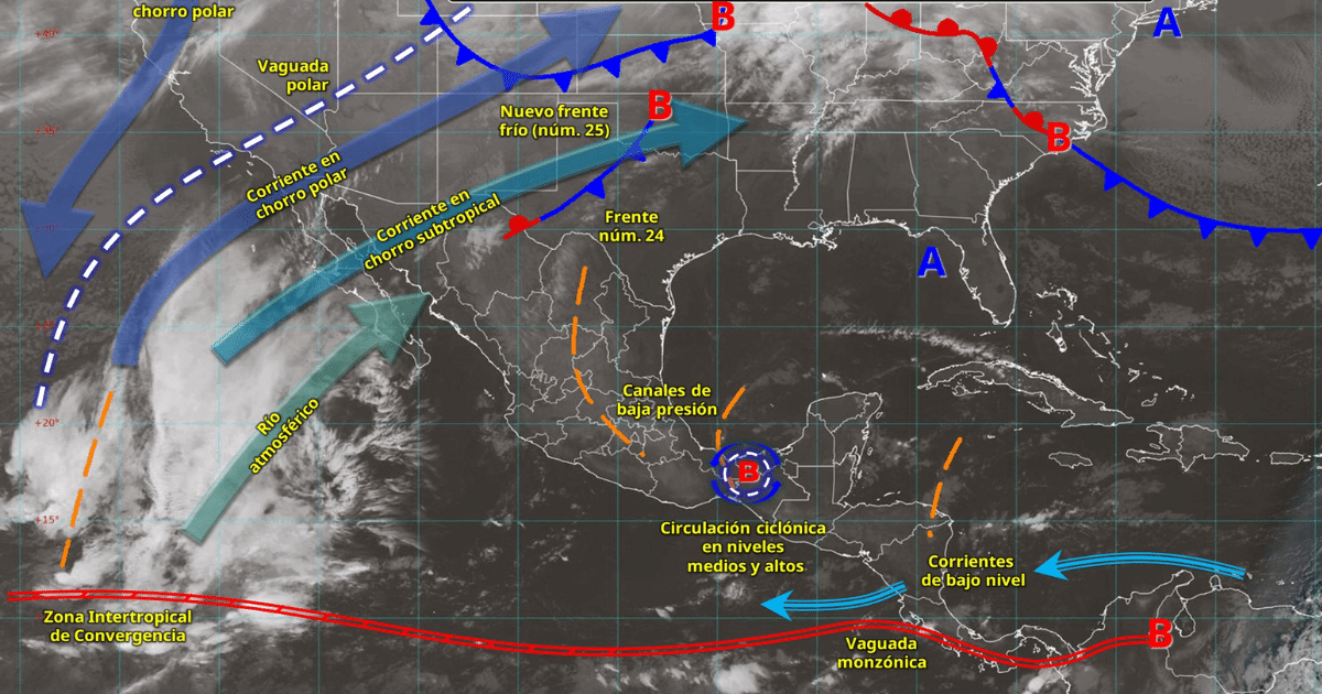 Durante el transcurso de este día, el frente frío número 24 comenzará a disiparse sobre el norte del país; sin embargo, por la tarde y noche se prevé el ingreso del frente frío número 25 por la frontera norte y noreste de México. Este sistema, reforzado por una masa de aire ártico, corrientes en chorro y un río atmosférico, provocará un marcado descenso de temperaturas, vientos fuertes a muy fuertes y lluvias en varias regiones.