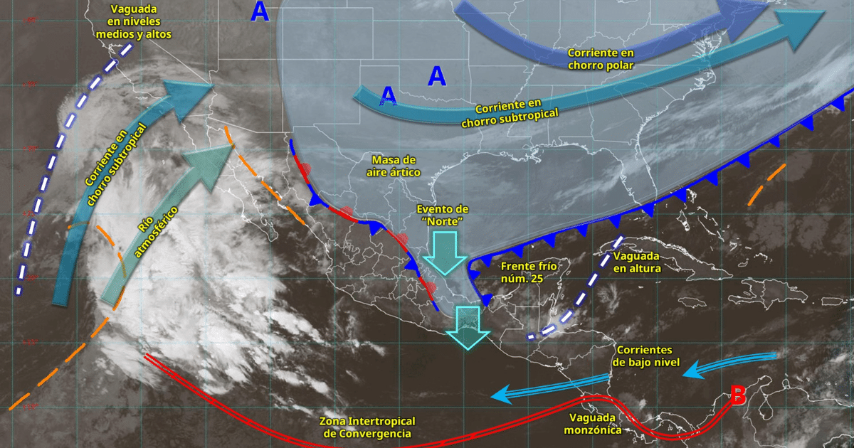 El frente frío 25 provocará lluvias intensas en México, con efectos torrenciales en Oaxaca, Veracruz, Chiapas y Tabasco, además de fuertes vientos y ambiente frío.