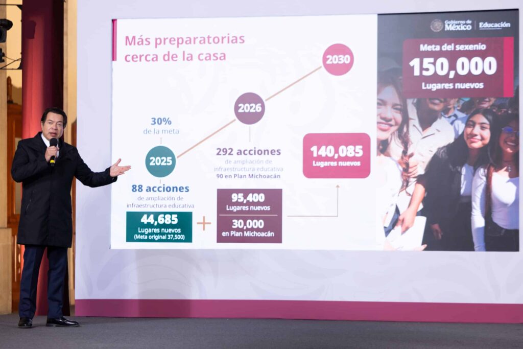 El Gobierno de México, a través de la Secretaría de Educación Pública (SEP), anunció que en 2026 se crearán 95 mil 400 nuevos lugares en Educación Media Superior a través de 292 acciones que contemplan la construcción de 20 Bachilleratos Tecnológicos cerca de la casa de los estudiantes, 52 ampliaciones, 130 nuevos Ciberbachilleratos, y en el marco del Plan Michoacán por la Paz y la Justicia, serán 10 Bachilleratos Tecnológicos, 20 ampliaciones y 60 Ciberbachilleratos.