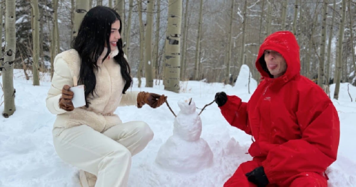 Durante el viaje, Peso Pluma y Kenia Os compartieron imágenes abrazados, besándose y construyendo un muñeco de nieve, además de una fotografía que llamó especialmente la atención: ambos aparecen recostados juntos usando pijamas a juego, en medio de un entorno nevado de ensueño.