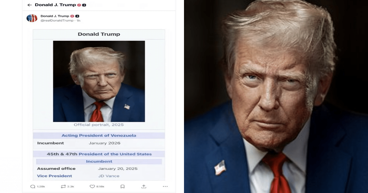 El presidente de Estados Unidos, Donald Trump, publicó en su red social una imagen donde se identifica como “presidente en funciones de Venezuela”, luego de una operación que llevó a la detención del mandatario venezolano Nicolás Maduro, generando debates sobre la legalidad y la repercusión política de esta acción.