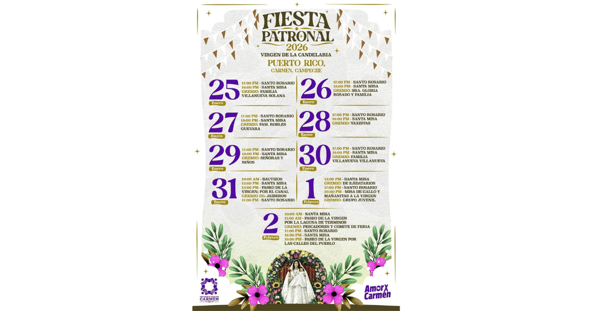 La comunidad de Puerto Rico se prepara para celebrar la Fiesta Patronal 2026 en honor a la Virgen de la Candelaria, una de las manifestaciones religiosas más arraigadas en la región. Del 25 de enero al 2 de febrero, fieles y visitantes podrán participar en una serie de actividades que combinan espiritualidad, identidad cultural y convivencia comunitaria.