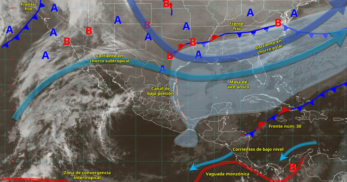 La masa de aire ártico asociada al frente frío número 30 continúa influyendo en el clima nacional. Se prevén lluvias puntuales fuertes en el sureste, rachas intensas de viento en zonas costeras y temperaturas bajas con posibles heladas en regiones del centro y norte del país.