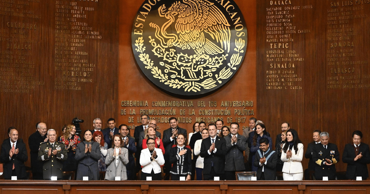 La presidenta de México encabezó la sesión solemne por el 109 aniversario de la Constitución Política de los Estados Unidos Mexicanos, en el Teatro de la República, en Querétaro, donde estuvo acompañada por gobernadoras y gobernadores, como Clara Brugada, de Ciudad de México; Delfina Gómez Álvarez, Estado de México; Mara Lezama, Quintana Roo; Joaquín Díaz Mena, Yucatán; Javier May Rodríguez, Tabasco, y Layda Sansores, Campeche, y los demás mandatarios estatales del país.