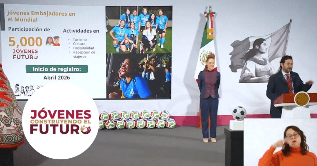 El programa Jóvenes Construyendo el Futuro se integra al espíritu del Mundial de Futbol 2026 con la nueva iniciativa “Jóvenes Embajadores en el Mundial”, mediante la cual 5 mil mujeres y hombres de entre 18 y 29 años colaborarán en actividades de turismo, cultura, hospitalidad y recepción de visitantes durante la justa internacional.