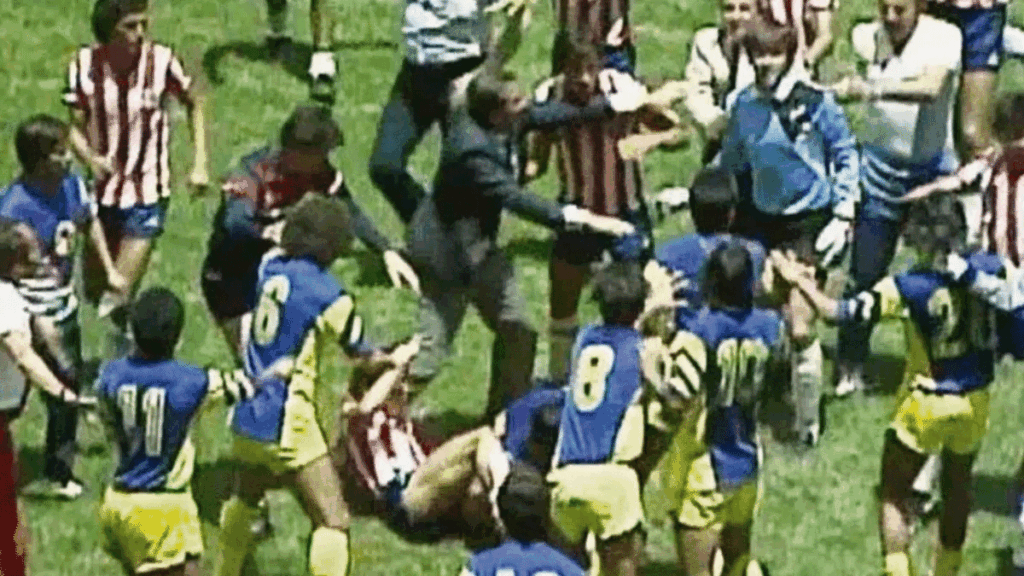 Lo que comenzó como una disputa física y fuerte por el balón, rápidamente derivó en una lluvia de golpes entre ambos que contagió al resto del equipo. La imagen de los dos gigantes intercambiando manotazos quedó grabada en la memoria colectiva de la afición.