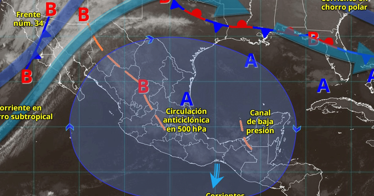 El Servicio Meteorológico Nacional monitorea la influencia de un sistema anticiclónico sobre gran parte de la República Mexicana, el cual generará condiciones atmosféricas que limitarán la dispersión de contaminantes y el incremento de las temperaturas diurnas en el transcurso de esta semana.