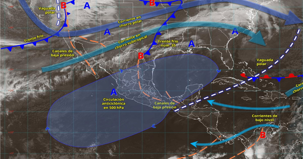 El frente frío número 35 se mantiene sobre el norte de México, mientras que un nuevo sistema frontal ingresará por el noroeste del país. Ambos fenómenos interactuarán con una vaguada polar y con las corrientes en chorro polar y subtropical, lo que provocará descenso de temperatura, rachas de viento fuertes a muy fuertes y precipitaciones en diversas zonas.