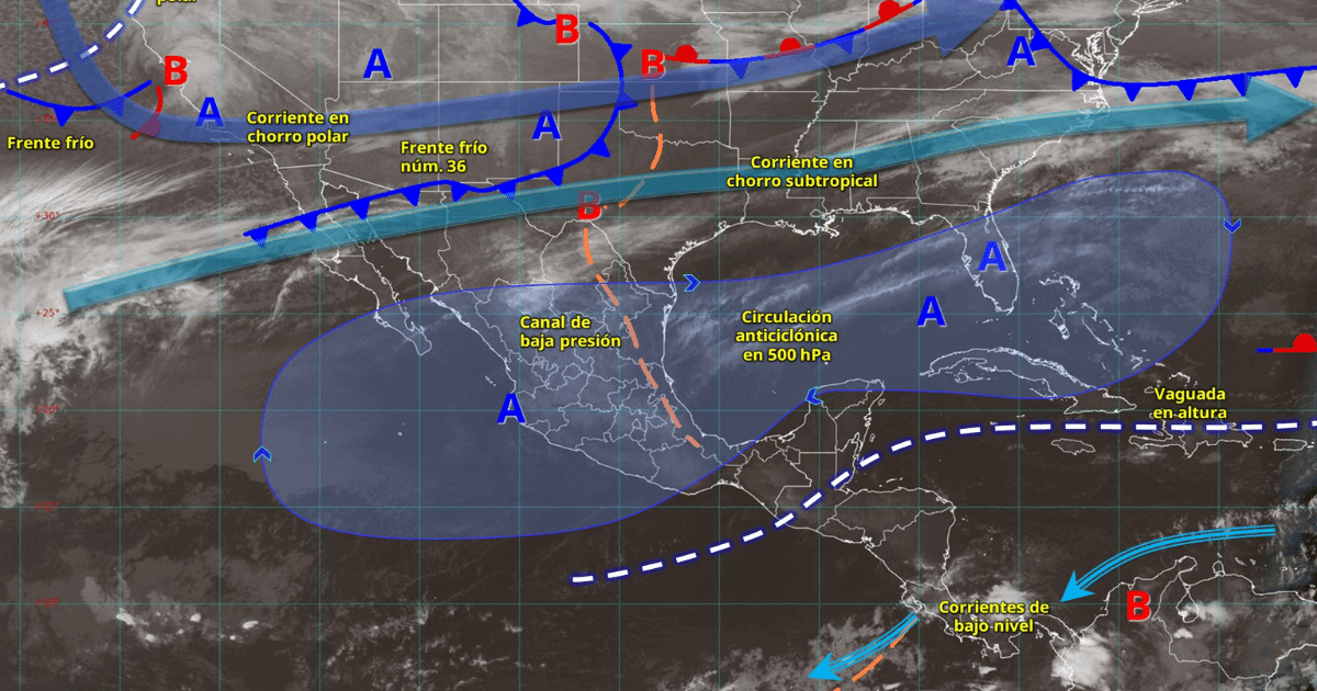 El frente frío número 36 se desplazará este día sobre el norte del país, donde interactuará con la corriente en chorro subtropical, una línea seca y un canal de baja presión en el noreste de México. A su vez, un nuevo sistema frontal se aproximará al noroeste, asociado con la corriente en chorro polar.