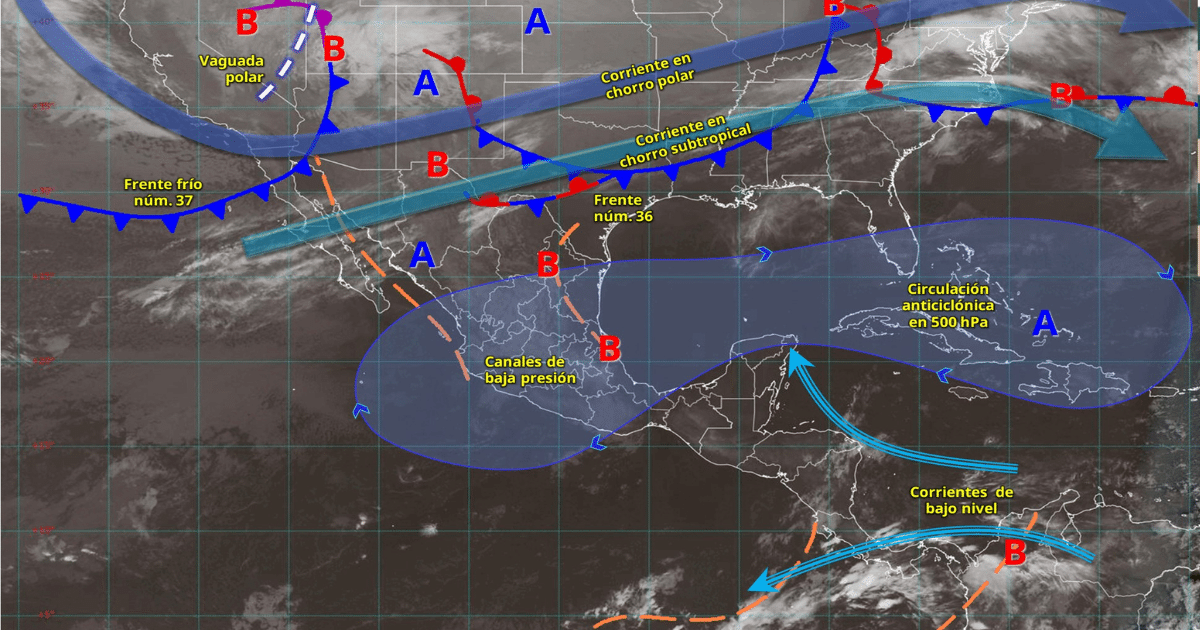 En contraste, un anticiclón favorecerá cielo despejado, baja probabilidad de precipitaciones y ambiente vespertino cálido a caluroso en gran parte del territorio nacional. También continuará la onda de calor en zonas de San Luis Potosí, Querétaro, Hidalgo, Jalisco, Michoacán y Oaxaca.