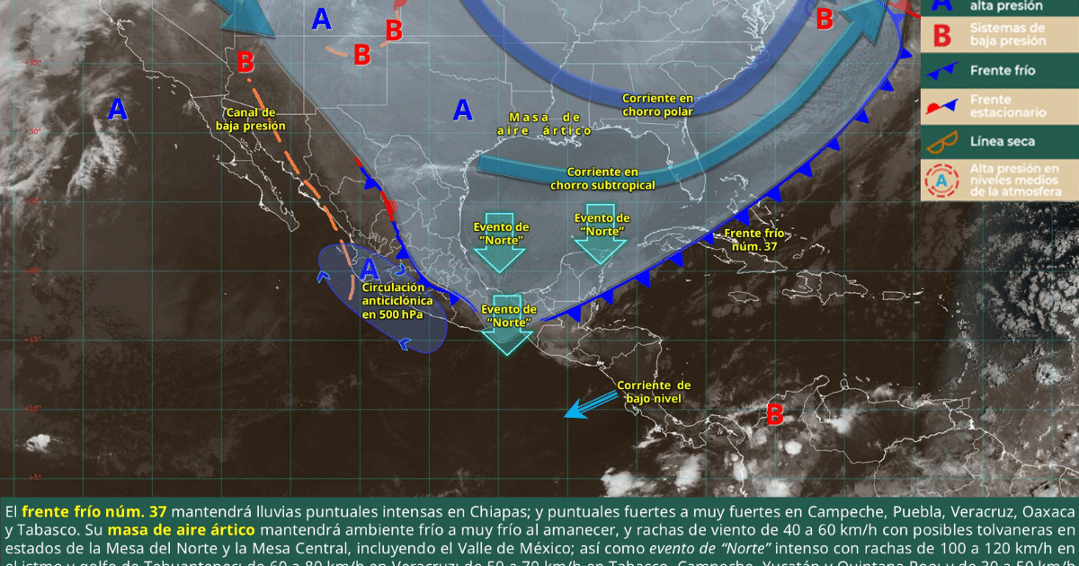 Para hoy, el frente frío núm. 37 se extenderá sobre el Mar Caribe y el sur de la península de Yucatán, sin embargo, se mantendrán las condiciones para lluvias puntuales intensas en Chiapas, muy fuertes en Veracruz, Oaxaca y Tabasco, fuertes en Puebla y Campeche. La masa de aire ártico asociada al frente frío, continuará generando ambiente frío a muy frío al amanecer y rachas de viento de 40 a 60 km/h con posibles tolvaneras en estados de la Mesa del Norte y la Mesa Central, incluyendo el Valle de México; así como evento de “Norte” intenso con rachas de 100 a 120 km/h en el istmo y golfo de Tehuantepec, de 60 a 80 km/h en Veracruz, de 50 a 70 km/h en Tabasco, Campeche, Yucatán y Quintana Roo, y de 30 a 50 km/h durante la mañana en Tamaulipas, con oleaje elevado en costas del golfo de México, Golfo de Tehuantepec y costas de la península de Yucatán.