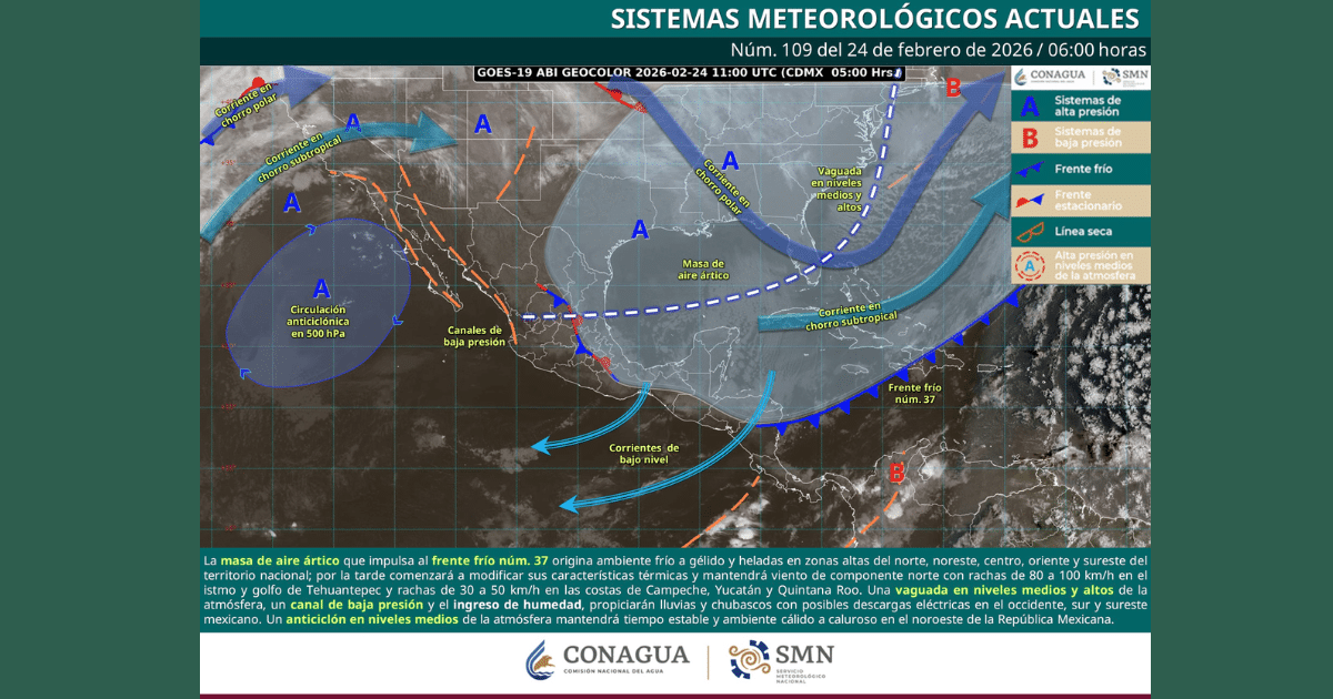 Clima hoy 24 de febrero de 2026: viento de “Norte” intenso en el Istmo y lluvias en el sur y sureste de México