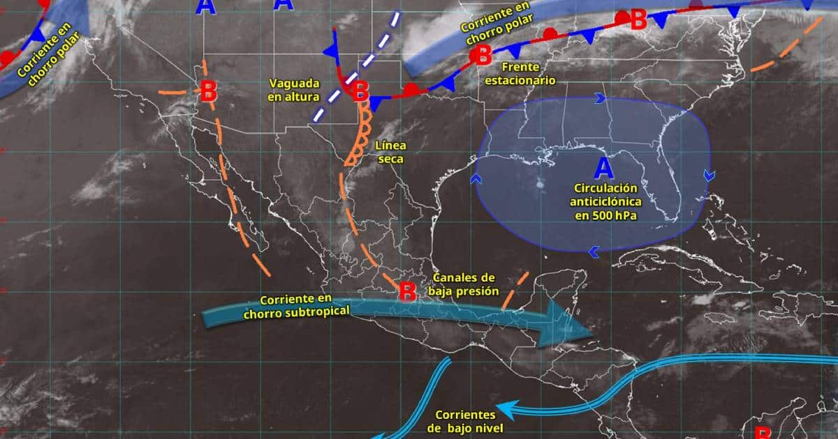 Por otra parte, una línea seca en el norte de México y una circulación anticiclónica en el golfo de México, propiciarán viento de componente sur con rachas de 50 a 70 km/h en Coahuila, Nuevo León y Tamaulipas.