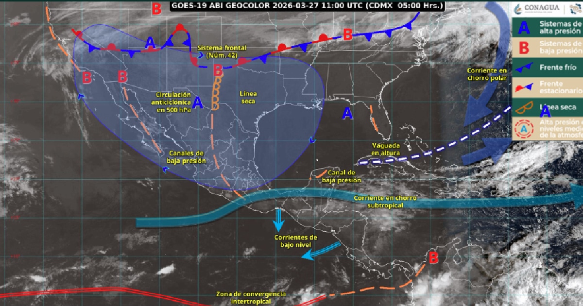 Para hoy, se pronostica el ingreso de un nuevo sistema frontal (núm. 42) al norte de México, interaccionará con un canal de baja presión sobre la Mesa del Norte, originará lluvias e intervalos de chubascos en el norte y noreste del país.