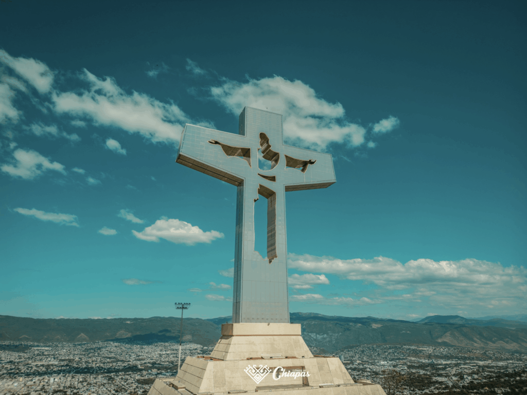 Diseñado por el arquitecto Jaime Latapí López, está hecho de acero inoxidable para resistir fuertes vientos y destaca por su figura en espacio negativo sobre una gran cruz.