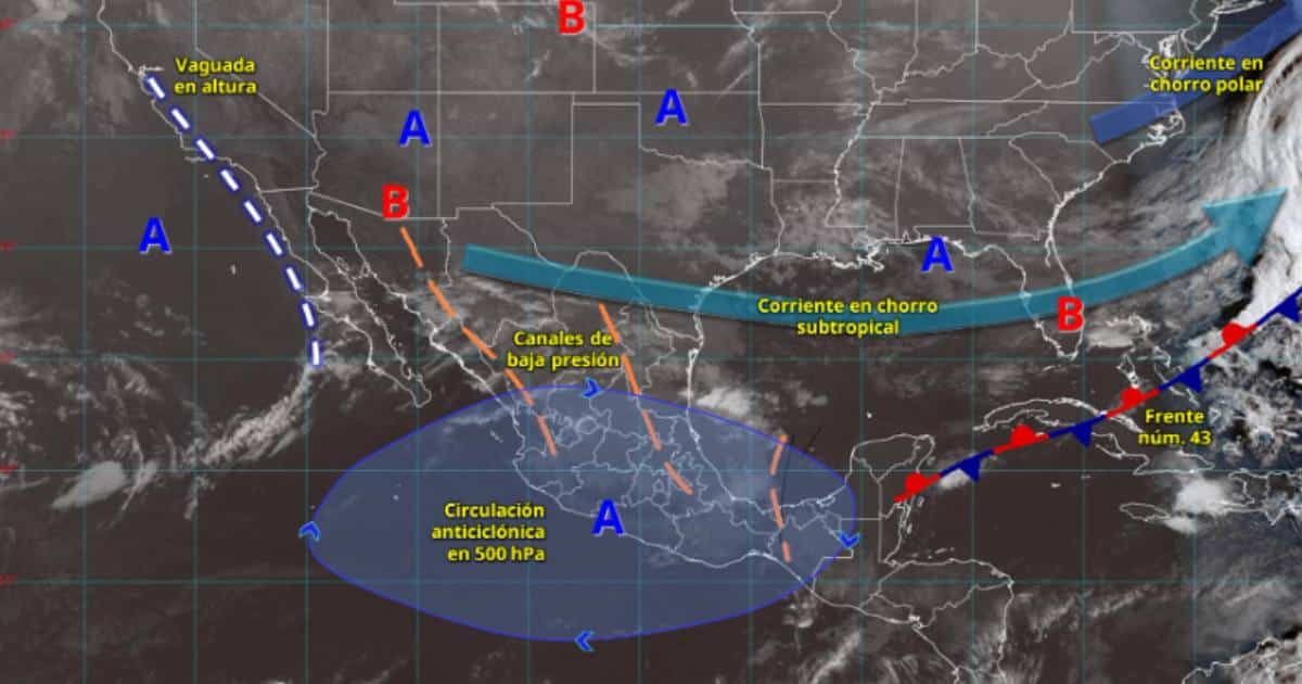 En contraste, la onda de calor continúa afectando a buena parte del país, con temperaturas que pueden superar los 40 y hasta los 45 grados en estados del norte, occidente y sur. Esta condición está asociada a una circulación anticiclónica que limita la formación de nubes y favorece un ambiente seco y extremadamente caluroso durante el día.