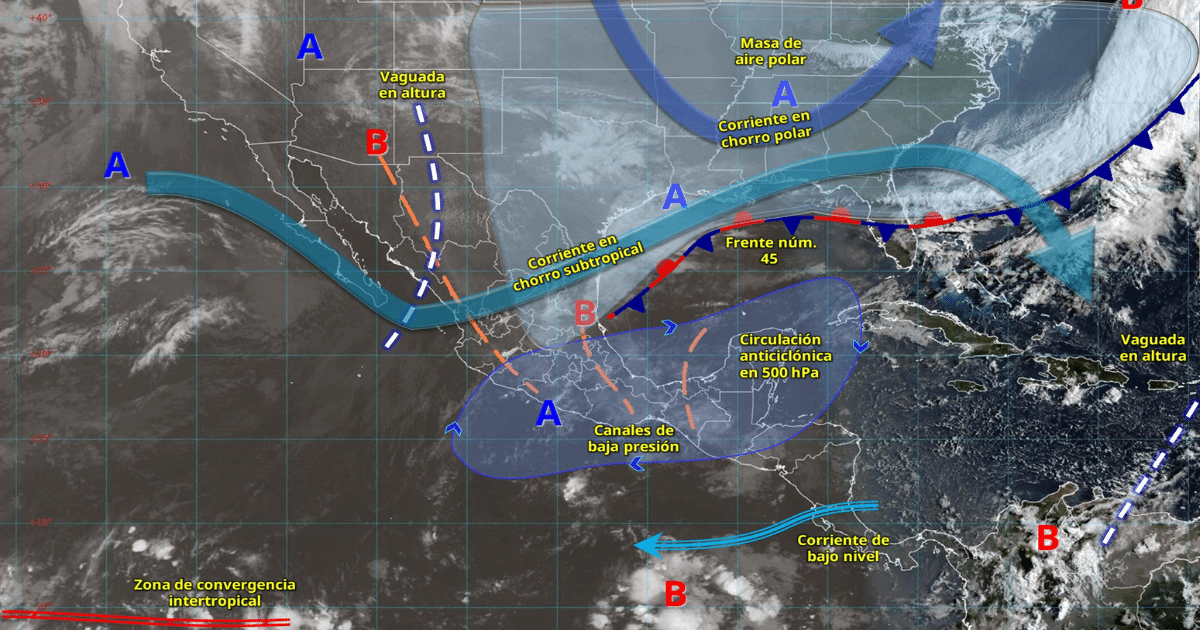 El frente frío número 45 se mantendrá como estacionario sobre el Golfo de México, interactuando con un canal de baja presión en el sureste y la entrada de aire húmedo del mar Caribe. Esto favorecerá lluvias fuertes en Veracruz, Oaxaca, Chiapas y Tabasco, así como chubascos en Campeche, Quintana Roo y Tamaulipas, además de precipitaciones aisladas en Yucatán. Se prevé que este sistema deje de afectar al país al finalizar el día.